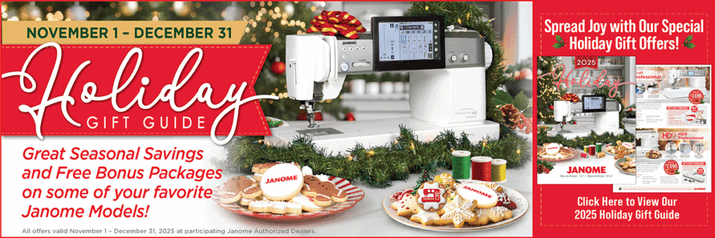 All offers are valid November 1 – December 31, 2024 at participating Janome Authorized Dealers. Offers based on Manufacturer’s Suggested Retail Price (MSRP) and may not be combined with any other offer. Pricing is valid with qualifying machine trade in. Void where prohibited.