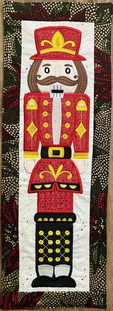 End Product: This machine embroidery design uses applique fabric and satin stitches to create the detail of this unique nutcracker haging.