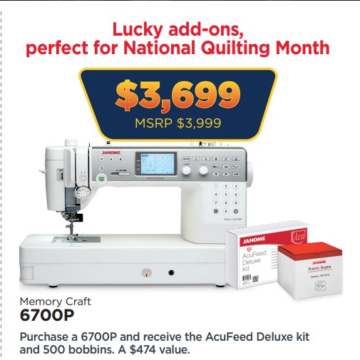 The Janome Memory Craft 6700P is a high-performance sewing machine designed for professionals and passionate sewists. With an industry-leading 1,200 stitches per minute, AcuFeed Flex™ fabric feeding, and a one-step needle plate conversion, the MC6700P delivers exceptional precision and power. Whether you’re quilting, tailoring, or working on heavy-duty fabrics, this machine ensures smooth, high-speed stitching with industrial-quality results.