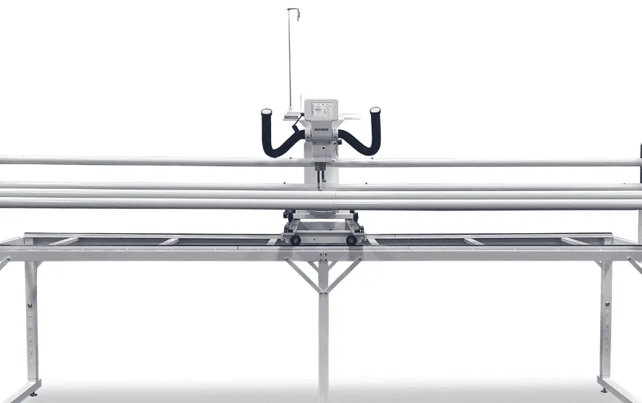 The Quilt Maker delivers the next step in your quilt making journey. Janome, the leader in innovative products that have changed the sewing industry, offers a longarm format sewing and quilting machine to support the beginner quilterโs sewing studio. The Quilt Maker 18 offers 18โ of quilting space. The Digital Tension Control system displays tension on the LCD touchscreen along with two stitch regulation modes: Precision and Cruise. Complete with Built-in Telescoping thread stand, and handlebars on the front with convenient magnetic strips. This machine exclusively utilizes the ProFrame 8 with a 2โฒ optional extension kit to achieve a 10โฒ full frame, and the bobbin winder is included!
